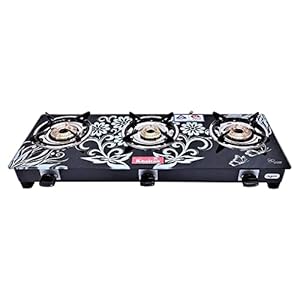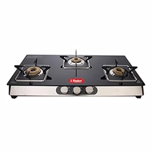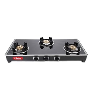 Bakelite knobs – This Manually Operated Gas Stove Comes with Smoothly Operated, Ergonomically Designed, Heat Resistant Bakelite knobs.Khaitan 3 Burner Crysta SS Black Toughened Glass LPG Gas Cooktop, Manual Ignition Gas Stove with 1 Year Warranty (ISI Approved)