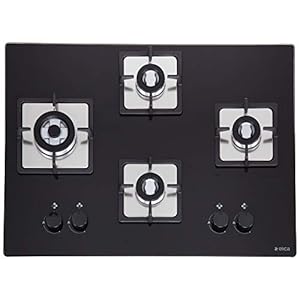 Vitreous Enameled pan supports for accommodation of heavy and large utensils with convenience | Fixed Stainless steel drip tray for cleaning of food spillageElica Hob 4 Burner Auto Ignition Glass Top – 1 Brass Mini Triple Ring and 3 Brass Double Ring Brass Burner (BRASS 4 B 70 NCI F)