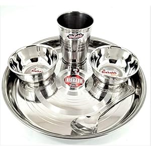 Multipurpose lunch and dinner set for everyday use The fine finish and design makes it to look elegant and can be used in parties and dinner and it can also be used as gifting for with the dinner set. Per Set contains 1 Piece Thali , 2 medium size Bowls , 1 Piece Drinking Glass and 1 Piece Spoon ( Wt 460 gm / set)