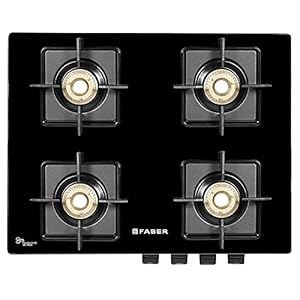 Nylon knobs with heat resistance,Anti-Skid Feet for easy operationsFaber Glass Top 4 Burner Gas Stove (Hob Cooktop Pearl 4BB BK) with Jumbo Burner, Diamond Coated Pan Support, Manual Ignition, Black