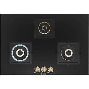 Bosch Built in Gas Hob Black Tempered glass Glass 3 Burner Auto Ignition 75 cm True Brass 2D Ring Burners with Matt Black Heat Shields & Cast Iron pan supports (PND7B6F20I)