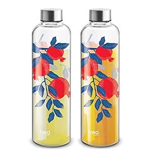Designer and durable glassware.Treo By Milton D’Ziner Clarion Borosilicate Glass Bottle, Set of 2, 750 ml Each, Pomegranate | Shakes | Smoothies | Water Bottle | Milk Bottle | Juice | Cocktail Bottle | Fusion Water | Chaas Bottle