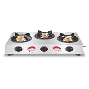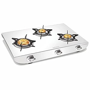 Original price was: ₹8368.₹5290Current price is: ₹5290.✅ Vector Plus 3 Burner Stainless Steel Gas Stove – Extra Large Cooking Surface & Widely Spaced Burners to accommodate Large Vessels with Jumbo, Medium & Small Brass Burners.