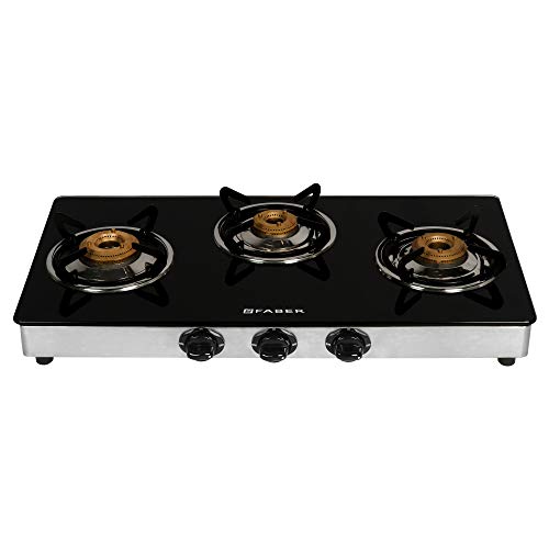 Faber Manual Ignition, Stainless Steel Gas Stove 3 Burner Glass Cooktop (Power 3BB Stainless Steel, Small), Black
